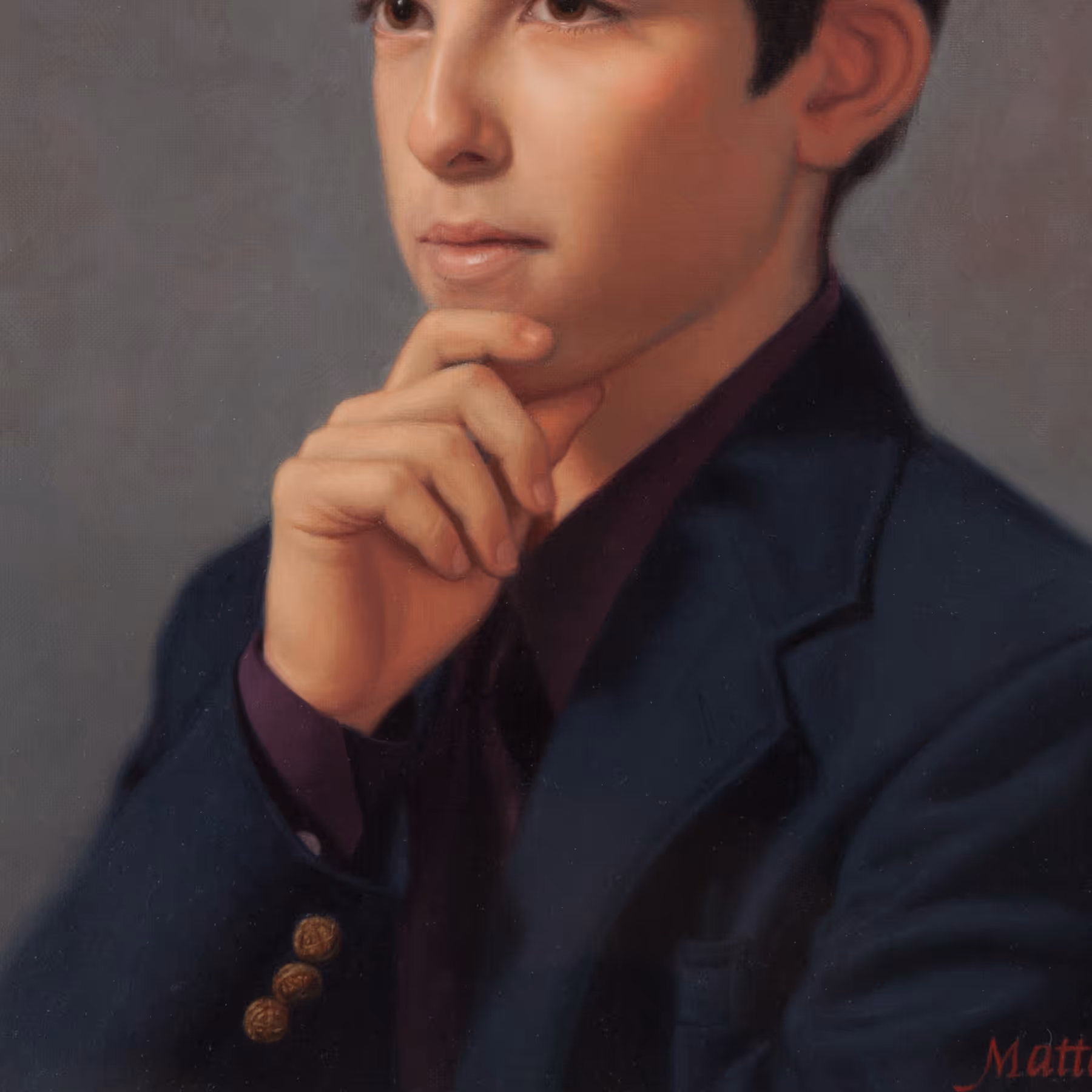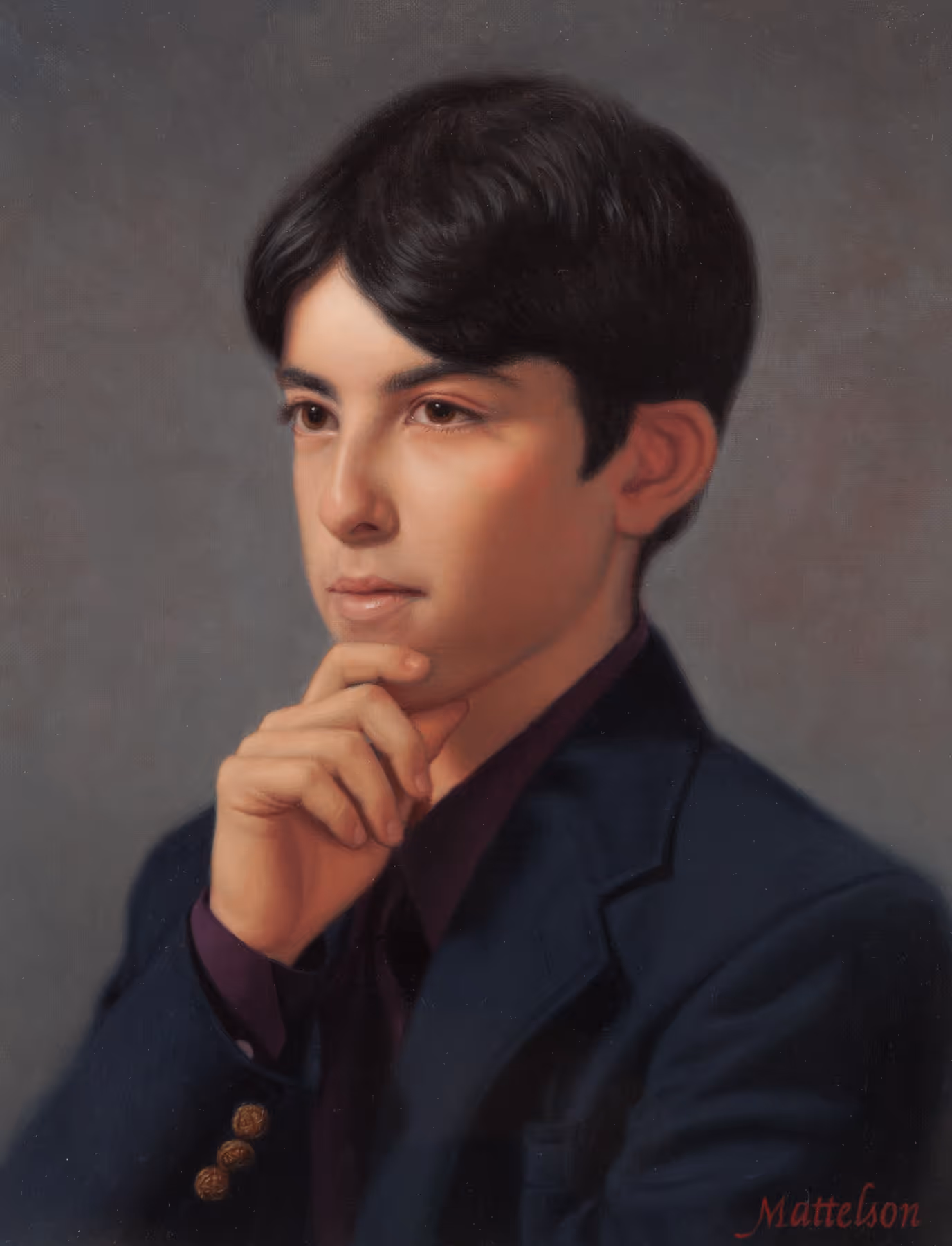 Michael's dark hair and clothing frame his face perfectly, making it the clear focal point of the portrait. The shape of the light is further contrasted by the tone of shadows and the similar background values. The strong lighting brings the focus where it needs to be, towards his softly and delicately painted features. This is an heirloom to be cherished always.